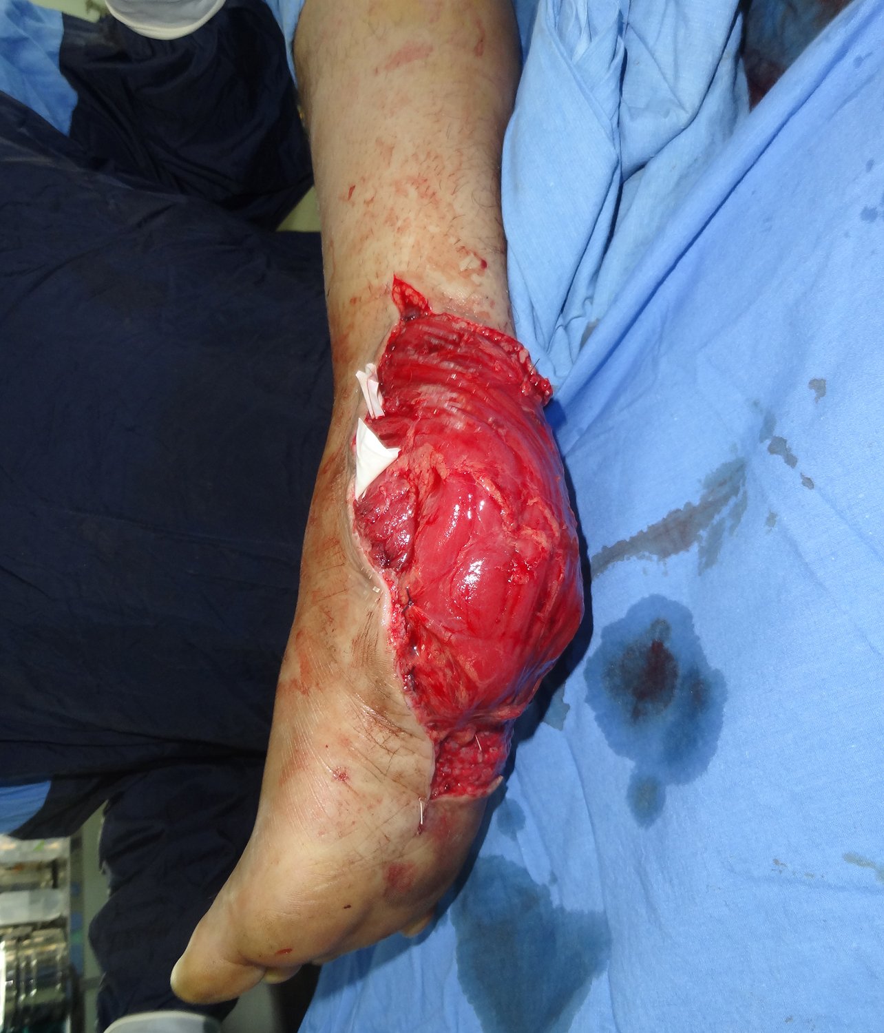 Used to cover large defects where muscle bulk is required, such as: